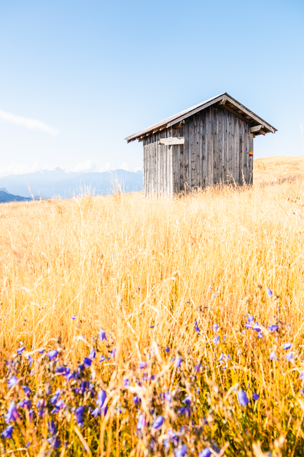 Cabane rustique isolée au milieu d’un vaste champ avec des fleurs. Format Portrait