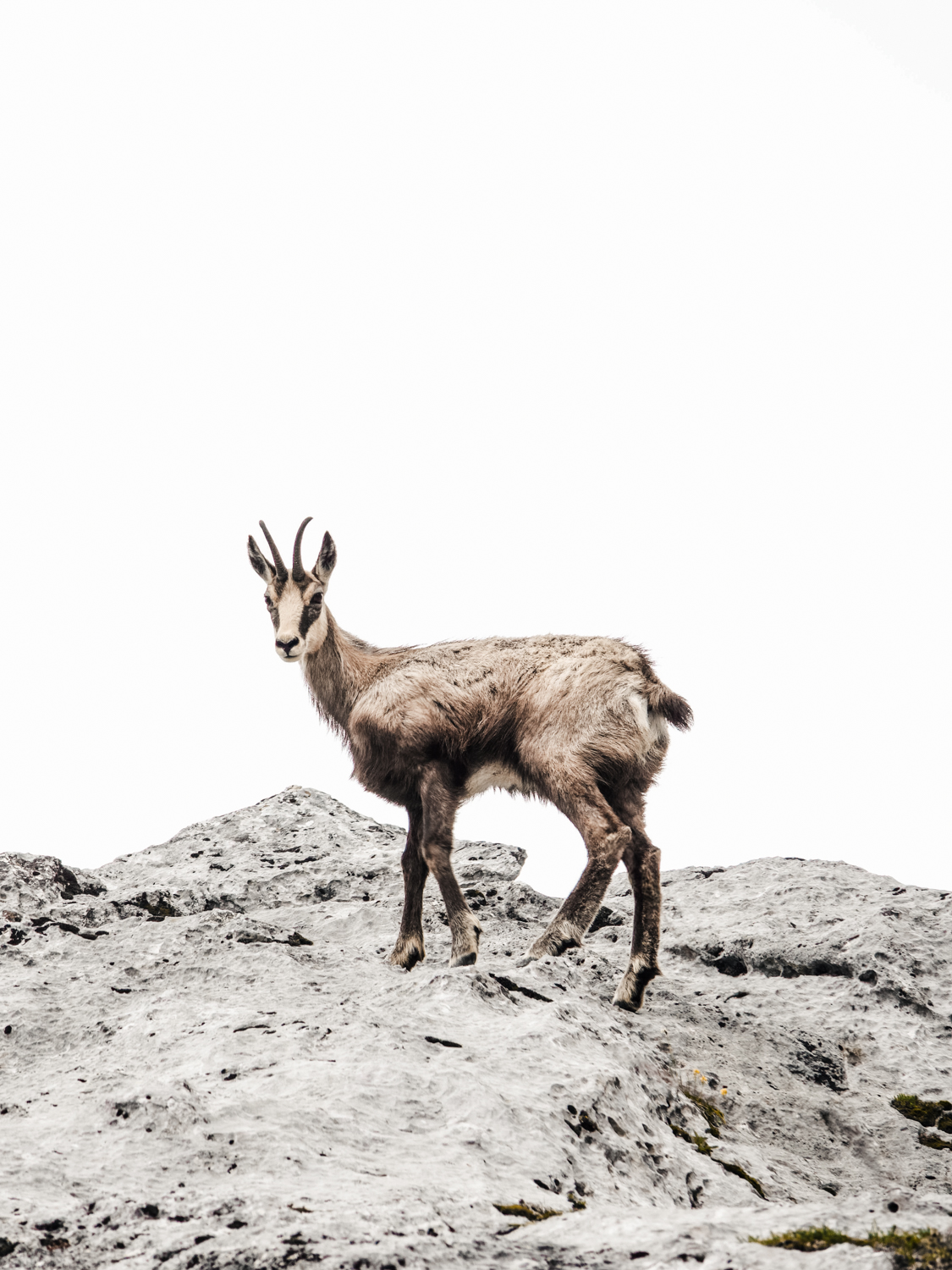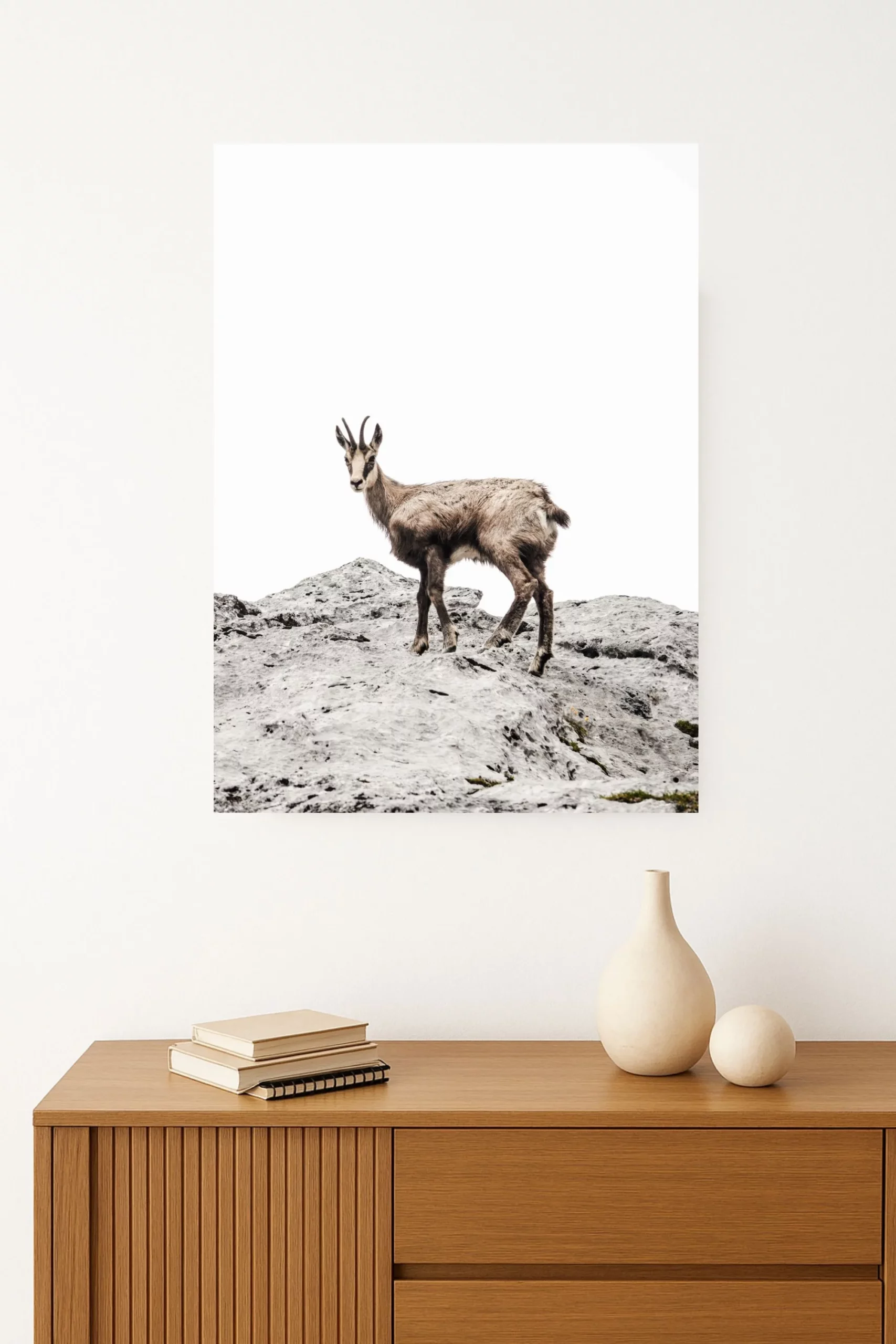 Chamois perché sur un rocher en montagne, capturé dans toute sa splendeur naturelle. Son pelage brun clair se détache du fond blanc épuré. La grâce de cet animal montagnard et sauvage est mise en valeur.