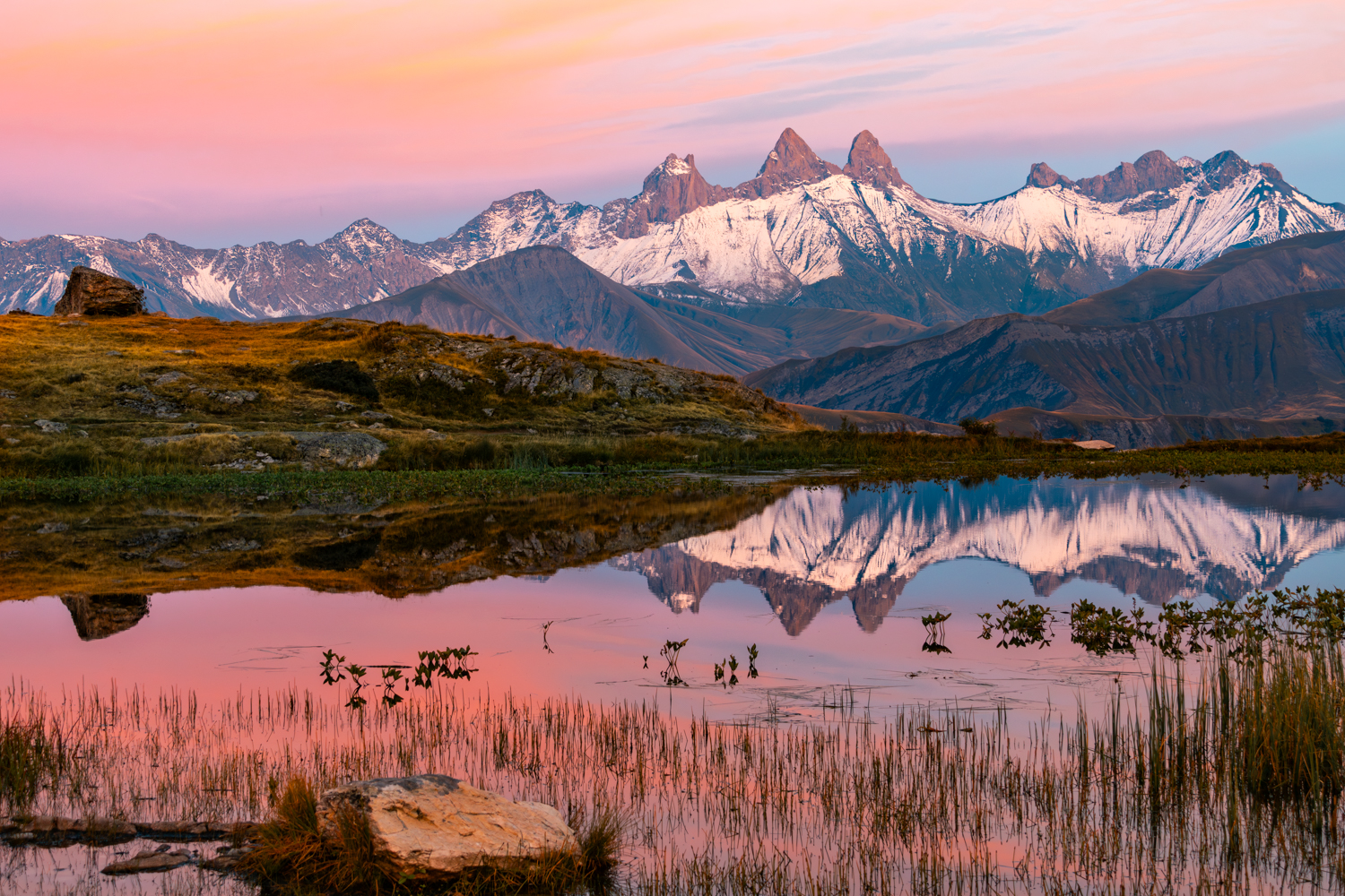 Le lac Guichard (Savoie) fait face aux majestueuses Aiguilles d’Arves, sublimé par les teintes rosées du coucher de soleil. Les sommets, légèrement enneigés, se parviennent parfaitement dans les eaux calmes du lac.
