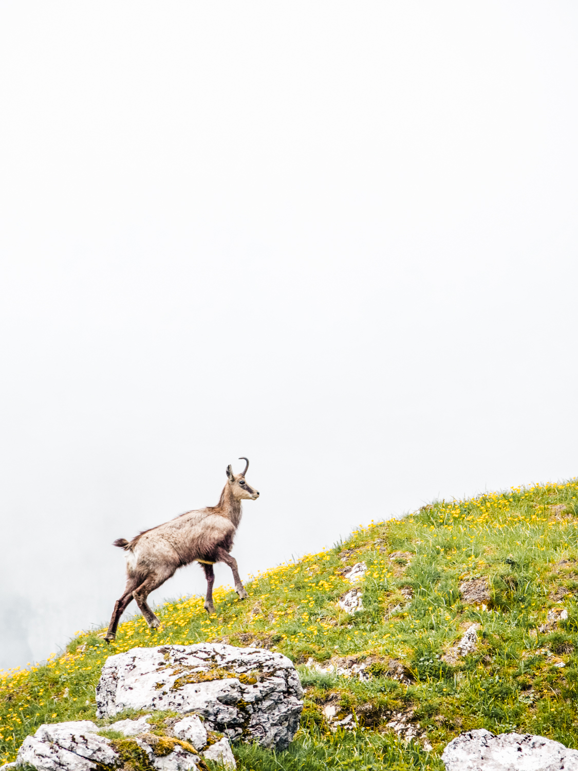 Chamois sur son lit d’herbe et de fleurs. Le mauvais temps permet de mettre en valeur la grâce de cet animal sauvage et montagnard.