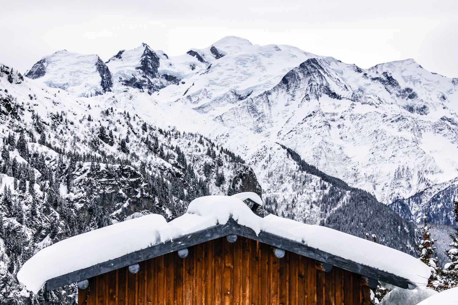 Le massif du Mont-Blanc surplombe un chalet. Ses glaciers sont recouverts de neige. Le chalet est spectateur de l’immensité de la montagne.